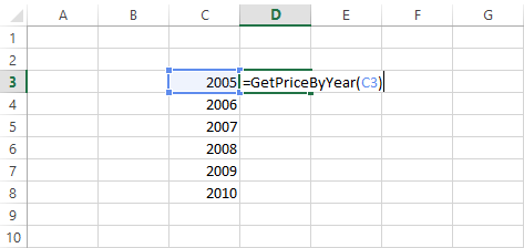 首先我会在C3 – C8 输入年份 2005 - 2010,这时候我需要在D3 - D8 使用函数 =GetPriceByYear(),参数就是C3 – C8的年份,然后从Web Service获取相应的数据写入其中。看到这里你可能会说用VBA就好了啊?VBA也可以调用Web Service啊,问什么这么麻烦用插件?