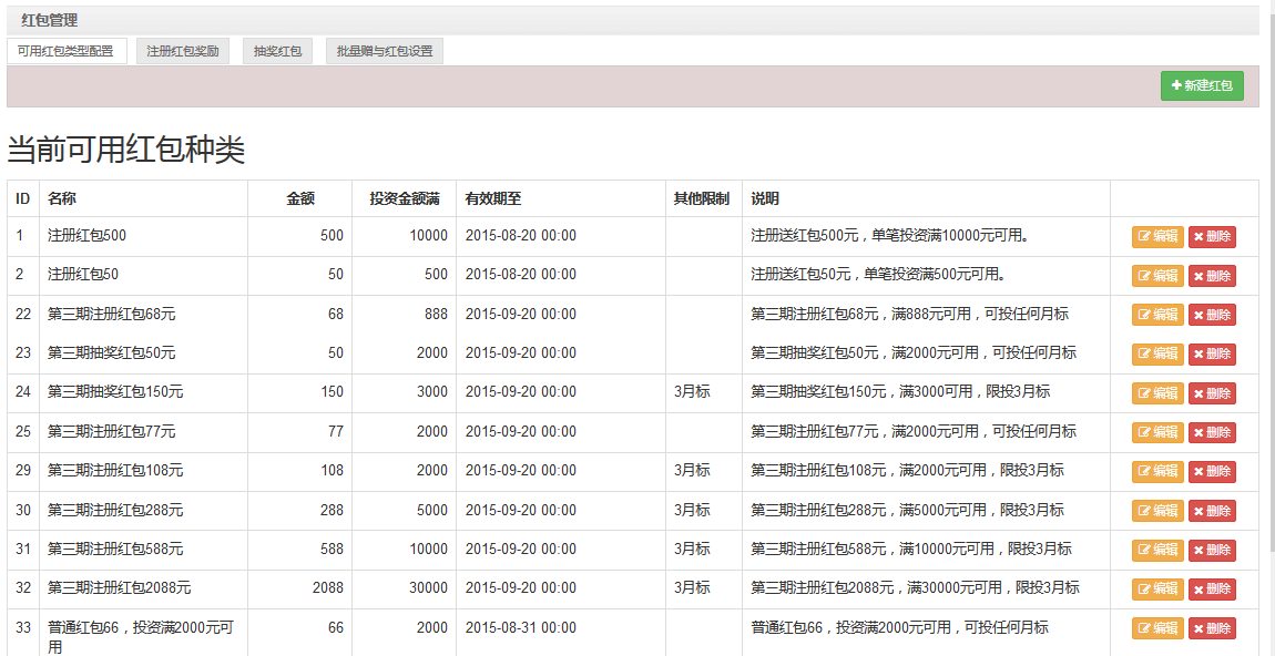 • 幸运大转盘:投资成功后,用户可获得抽奖机会;抽奖可以获取实物、现金券,加息券,红包和体验金;抽奖条件、奖励物品可通过后台配置