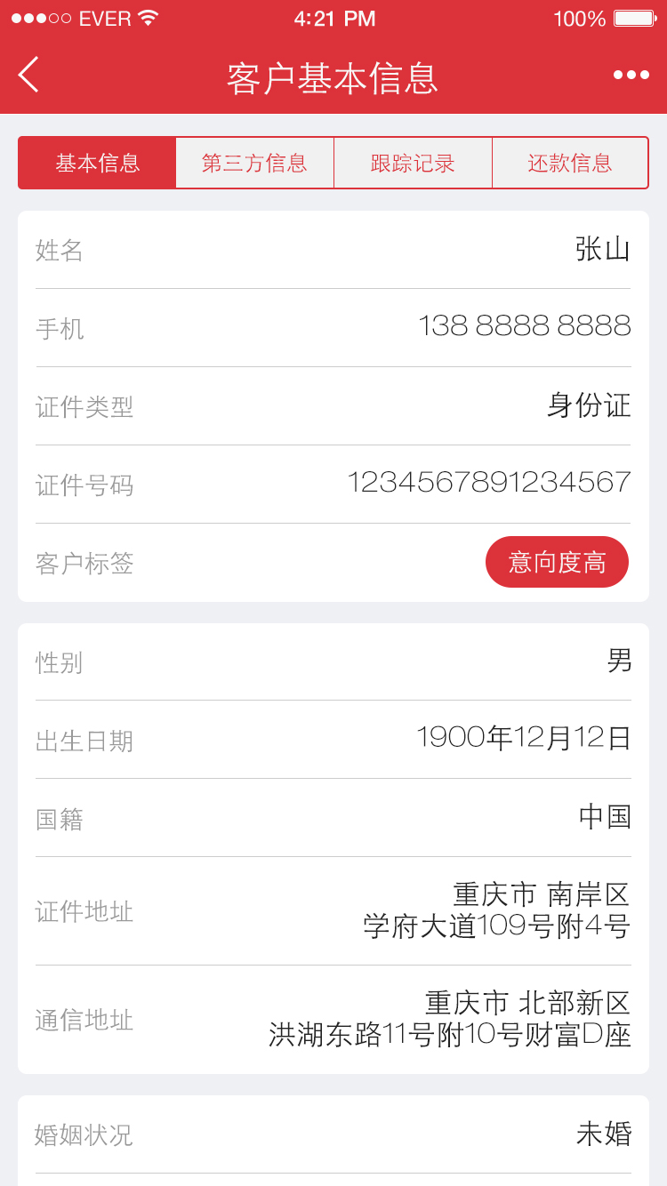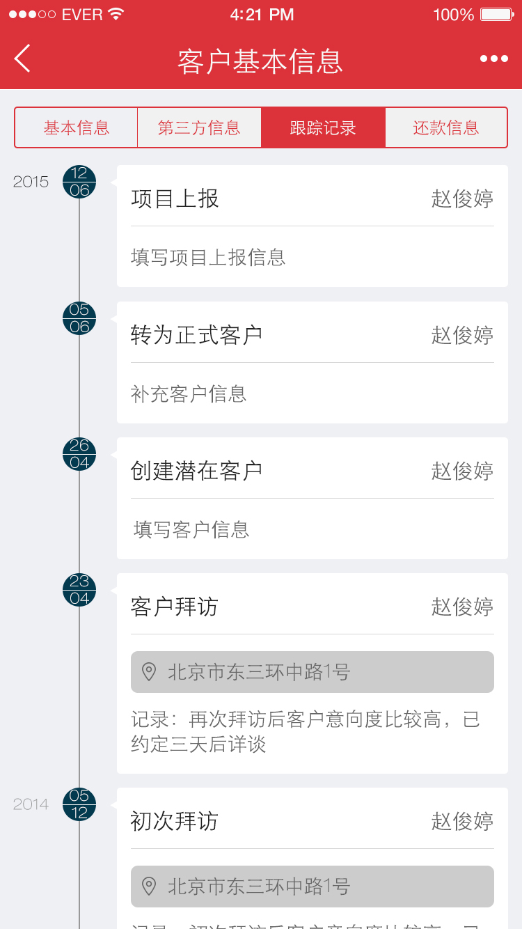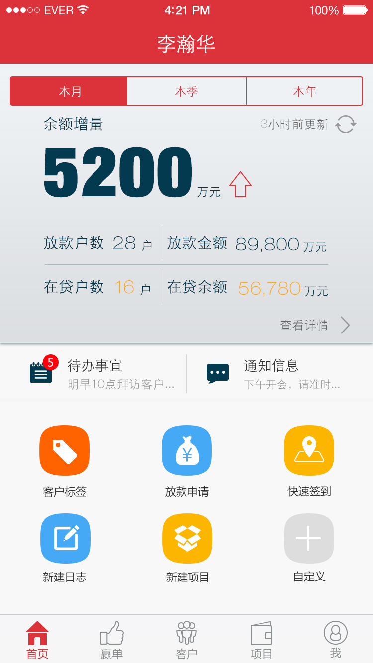 1、 员工能够使用App处理大部分业务,包括客户管理、贷款申请审核、贷款项目及状态查看、日程安排及工作日志管理、个人的概要信息总览和基础设置等等