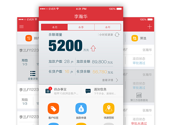 原来客户办理业务主要以纸质资料为主,这样就出现了内部信息沟通不顺畅,效率低下等问题。了解客户具体情况之后,根据客户需求我们将用户管理、贷款申请审核、贷款项目及状态查看、日程安排及工作日志管理等业务都搬到线上APP,彻底解决了上述问题。