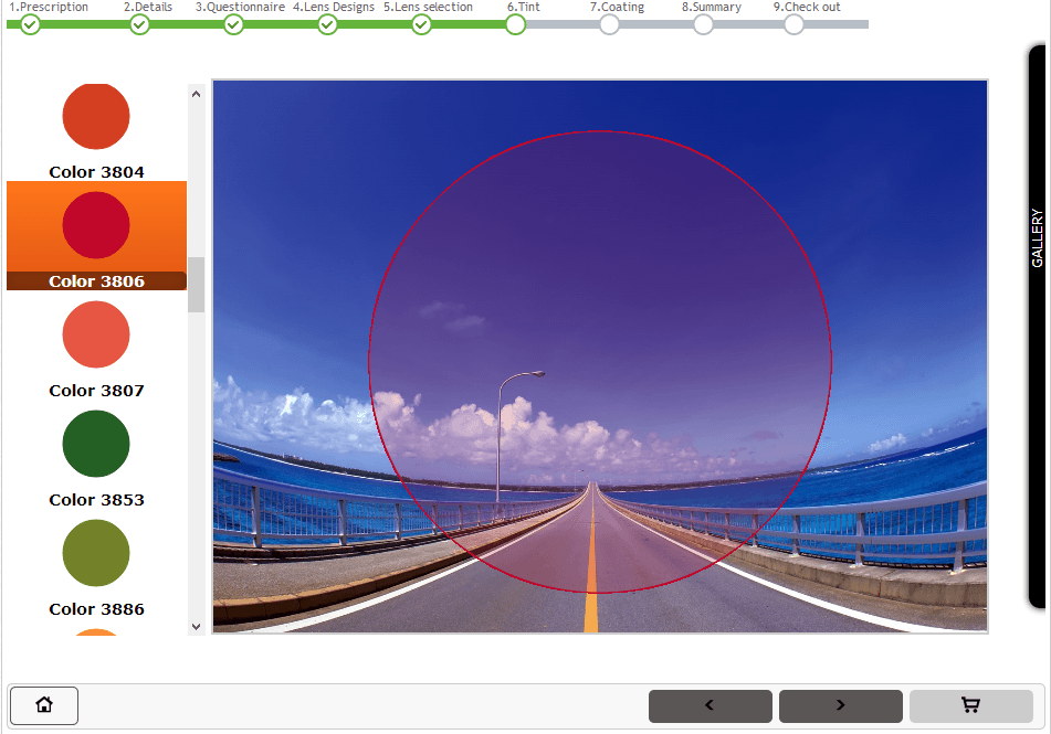 除了可以预览镜片的清晰度效果,在上色这一步骤里,在页面左侧,通过镜片自身的颜色参数生成的小圆块,能够使你直观看到不同上色方案的最终效果。