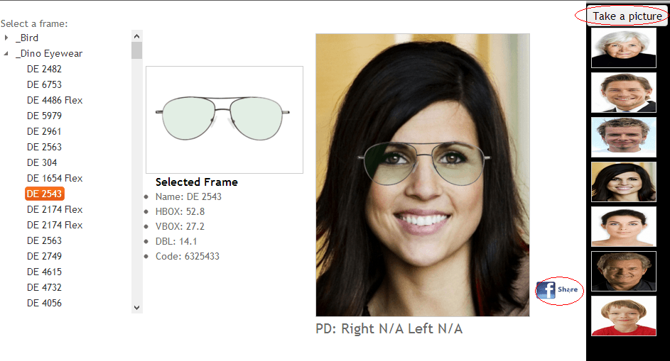 在另外一个Try on Page 里,你可以选择带有镜框(Frame)的镜片进行试戴,这里有一些预先放好的模特的照片,可以让你看到最终效果。